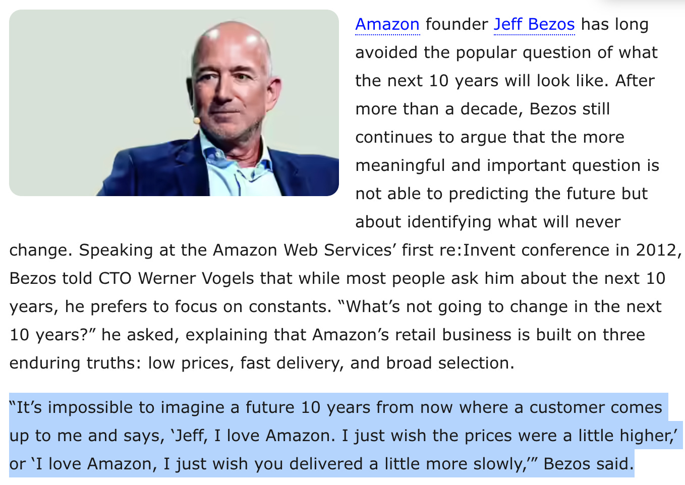 Bezos has this famous interview. The idea is that he did not know what the future held. E-commerce could have been just a fad.